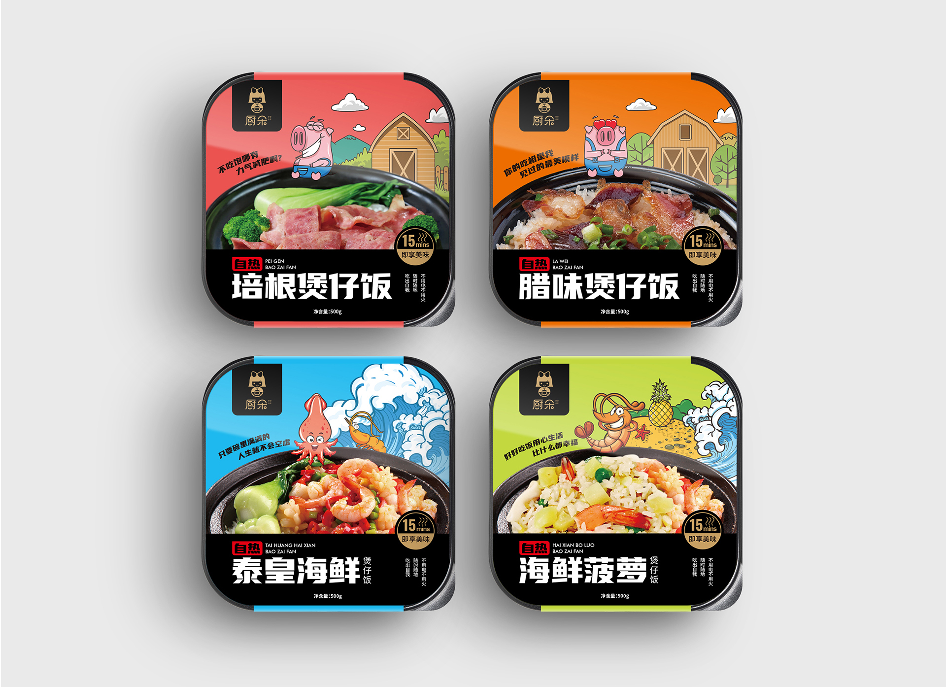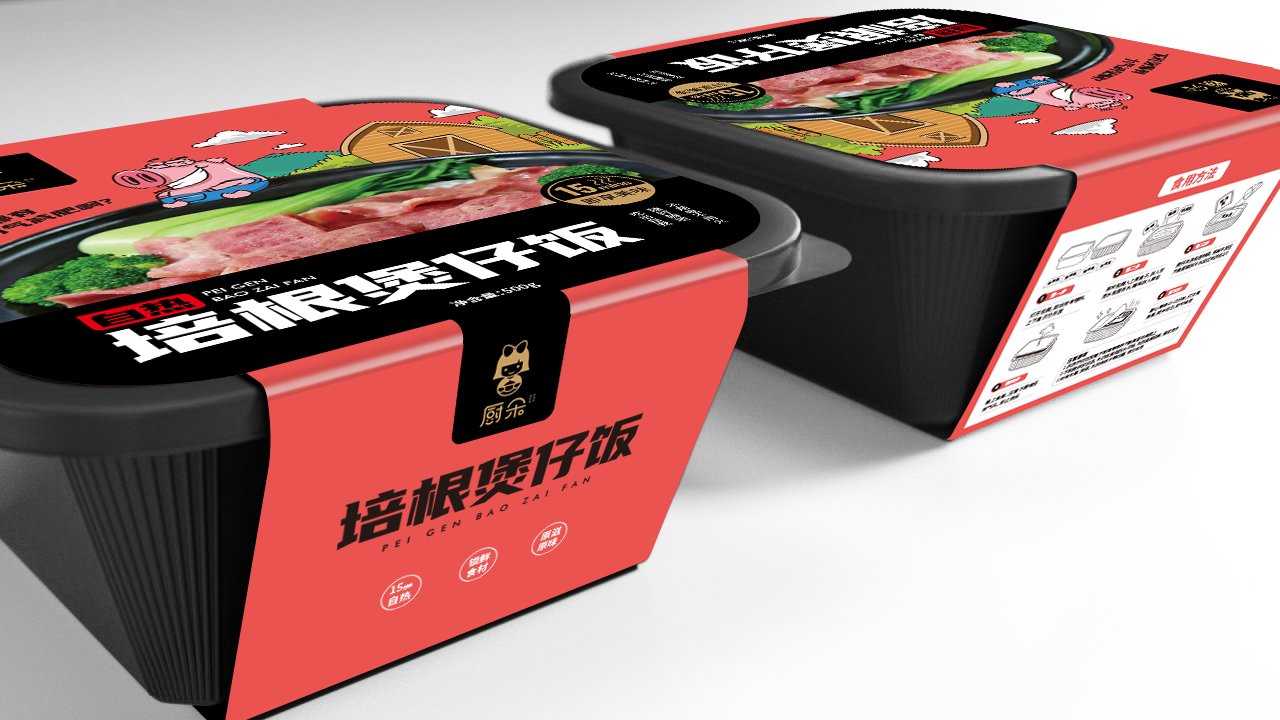廚朵自熱飯餐飲品牌設計中的包裝設計項目,包裝畫面元素虛實結合,寫實可口的煲仔飯照片,配上可愛的卡通插畫和趣味文案,整個包裝時尚有趣且貼合廚朵的品牌定位,年輕、可愛、有趣。