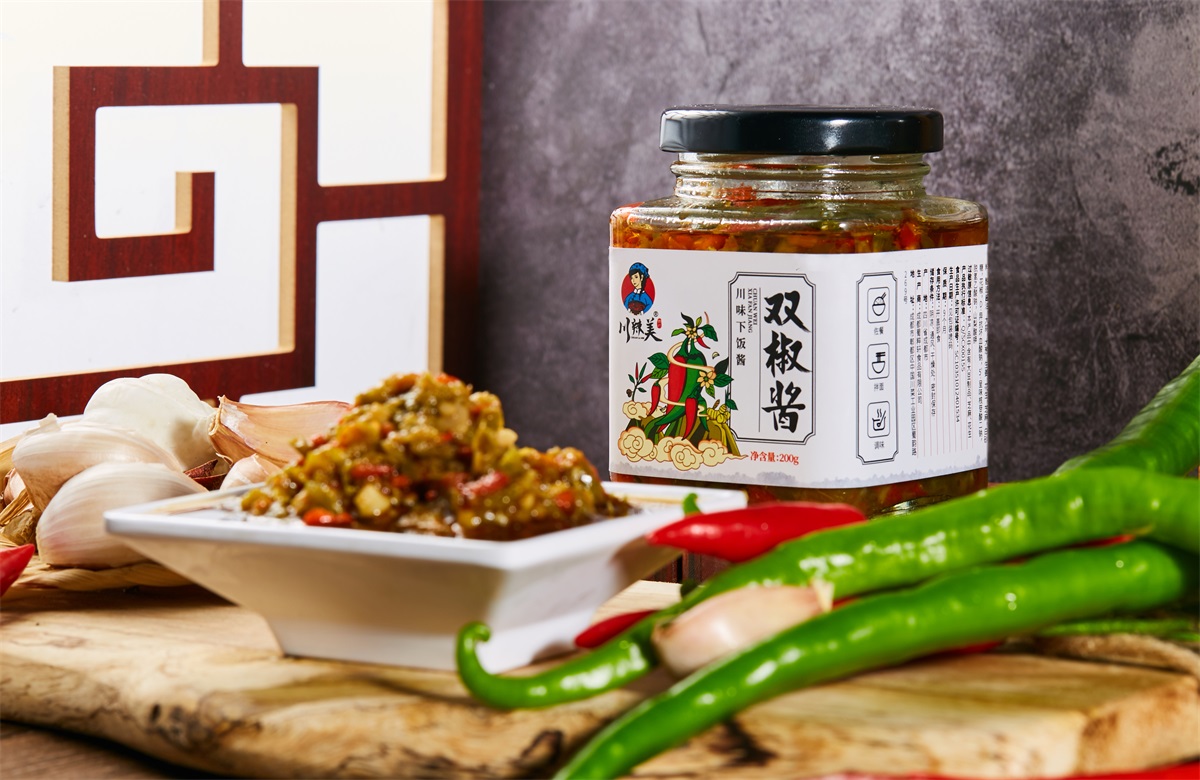 川辣美辣椒醬屬于地方特產類,本方案選用了方形的玻璃瓶+瓶身標簽設計的形式。 來自四川的美味辣椒醬品牌,古風、韻味、親和,從品牌logo設計,包裝瓶的選擇,到系列包裝形象設計,方案將雙椒醬、燒椒醬、香菇醬、香菇牛肉醬四個品類以插畫風格進行創作,以系列感來呈現,品牌感強,接地氣
