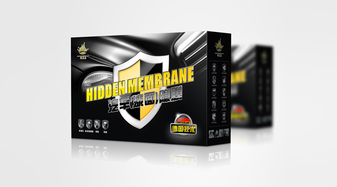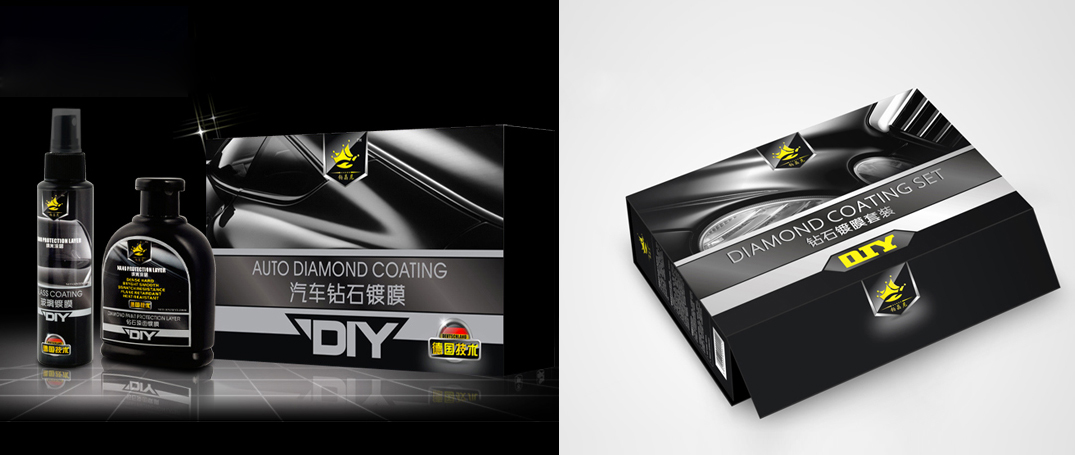 鉑晶尼汽車養護用品包裝設計以黑色為主色色,通過黑色和銀色的對比,將鉆石鍍膜的品質感呈現出來